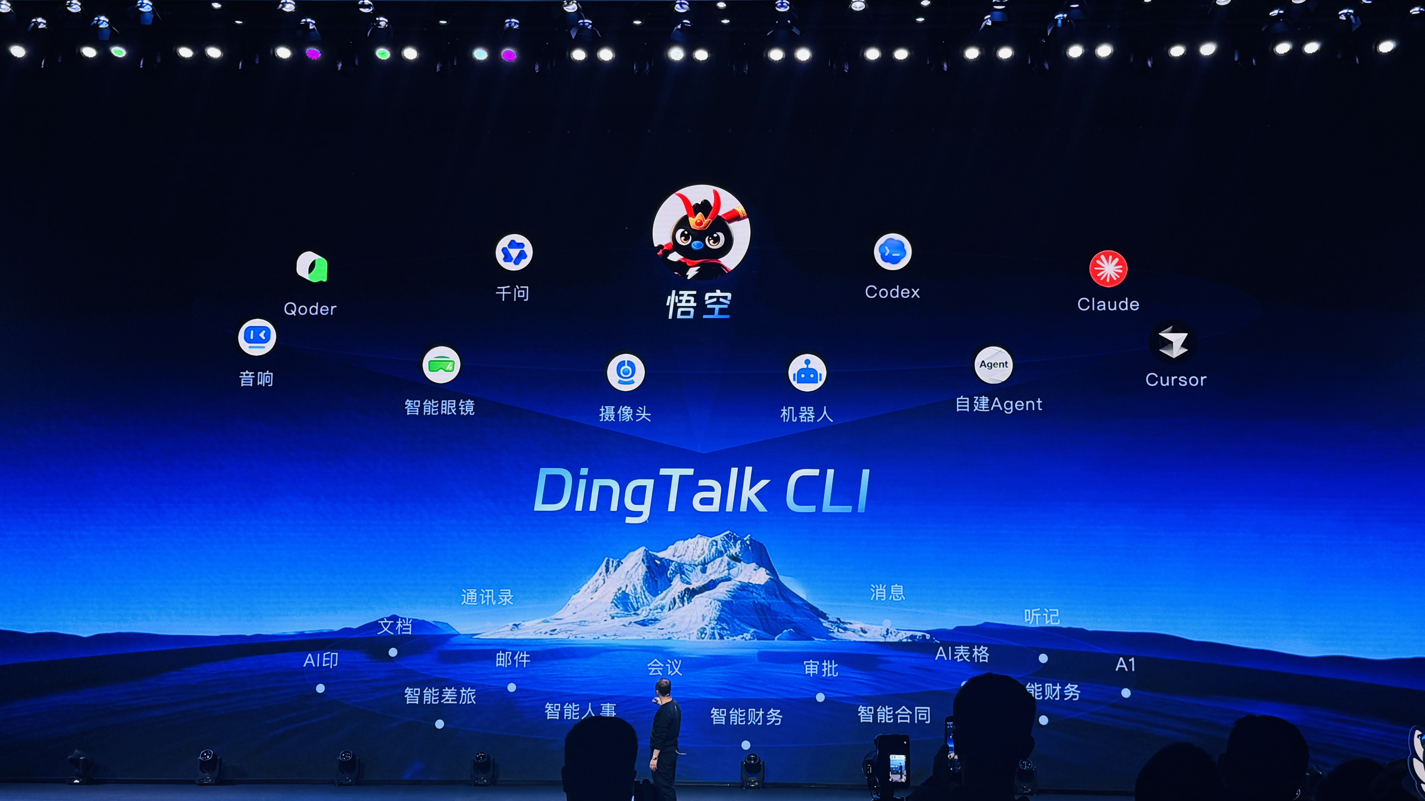 DingTalk CLI向上支撑悟空以及千问、Claude、Qoder等内外部的Agent产品及模型,可接入智能眼镜、机器人等多种设备;向下内置钉钉已有的文档、邮件、会议、批阅等很多功用组件。